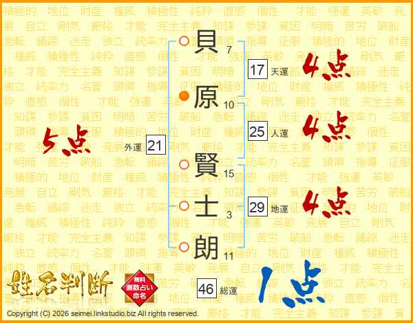 貝(7画)原(10画) 賢(15画)士(3画)朗(11画)