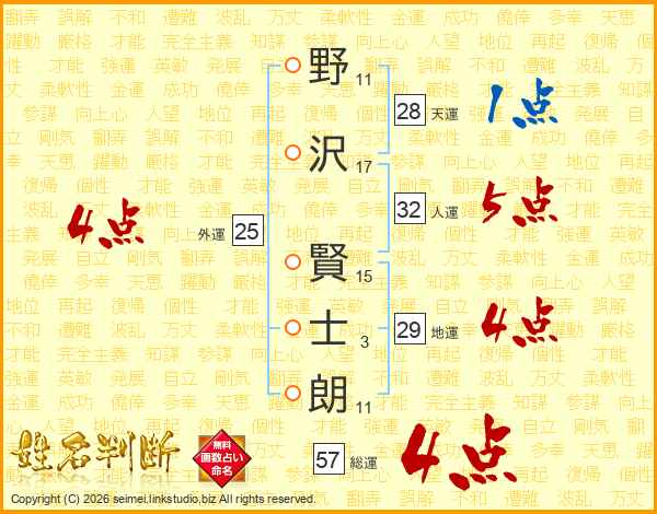 野(11画)沢(17画) 賢(15画)士(3画)朗(11画)