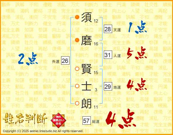 須(12画)磨(16画) 賢(15画)士(3画)朗(11画)