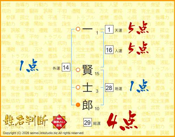 一賢士郎さんの総運は29画の4点!