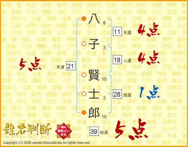 八子賢士郎さんの総運は39画の5点!