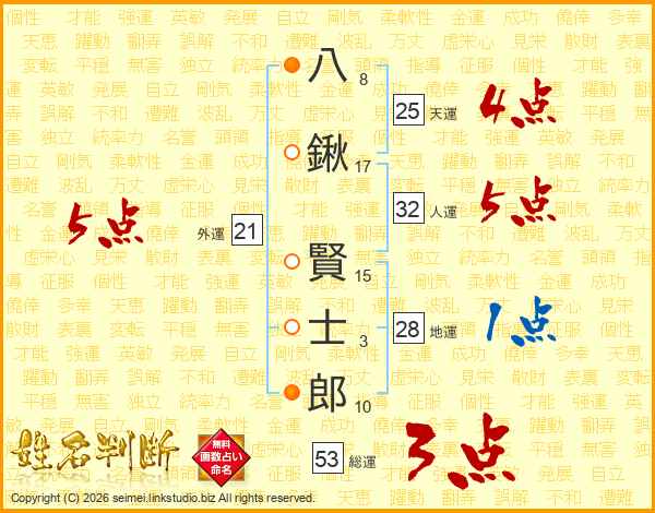 八(8画)鍬(17画) 賢(15画)士(3画)郎(10画)