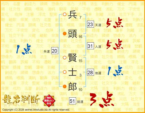 兵(7画)頭(16画) 賢(15画)士(3画)郎(10画)