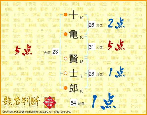十(10画)亀(16画) 賢(15画)士(3画)郎(10画)