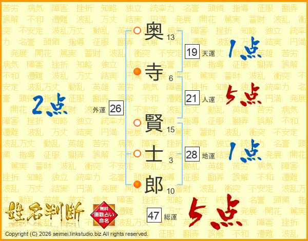 奥(13画)寺(6画) 賢(15画)士(3画)郎(10画)