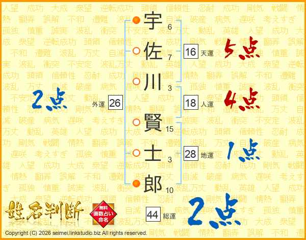 宇(6画)佐(7画)川(3画) 賢(15画)士(3画)郎(10画)