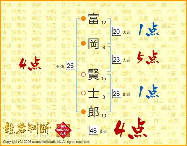 富(12画)岡(8画) 賢(15画)士(3画)郎(10画)