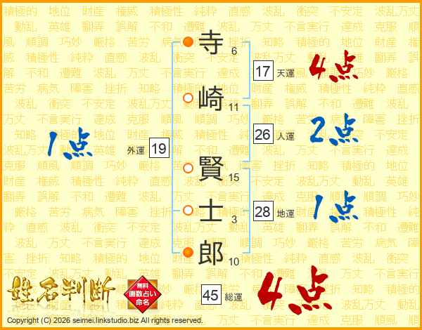寺(6画)崎(11画) 賢(15画)士(3画)郎(10画)