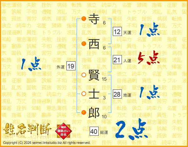 寺西賢士郎さんの人運は21画の5点!