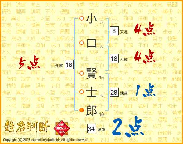 小(3画)口(3画) 賢(15画)士(3画)郎(10画)
