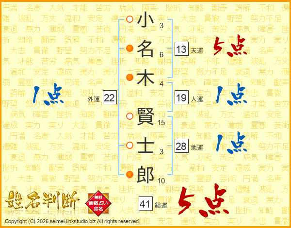 小(3画)名(6画)木(4画) 賢(15画)士(3画)郎(10画)