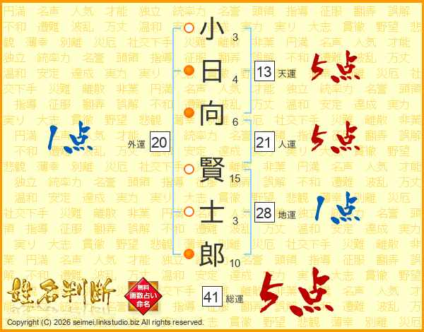 小(3画)日(4画)向(6画) 賢(15画)士(3画)郎(10画)