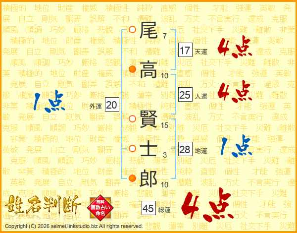 尾(7画)高(10画) 賢(15画)士(3画)郎(10画)