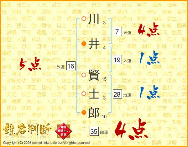 川(3画)井(4画) 賢(15画)士(3画)郎(10画)