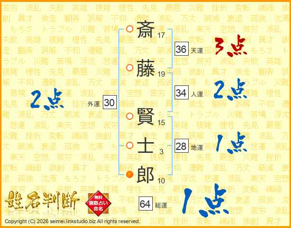 斎(17画)藤(19画) 賢(15画)士(3画)郎(10画)