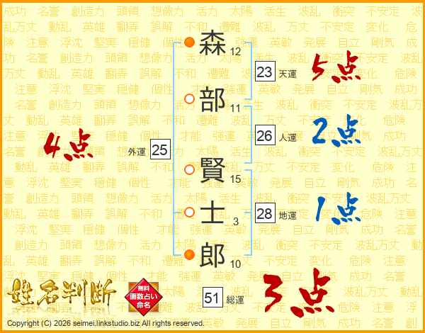森(12画)部(11画) 賢(15画)士(3画)郎(10画)
