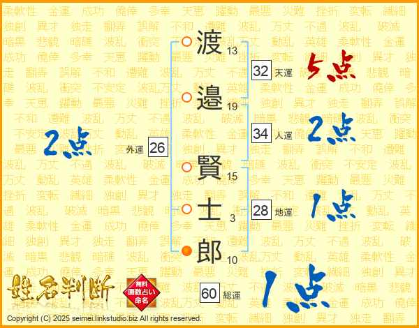 渡(13画)邉(19画) 賢(15画)士(3画)郎(10画)