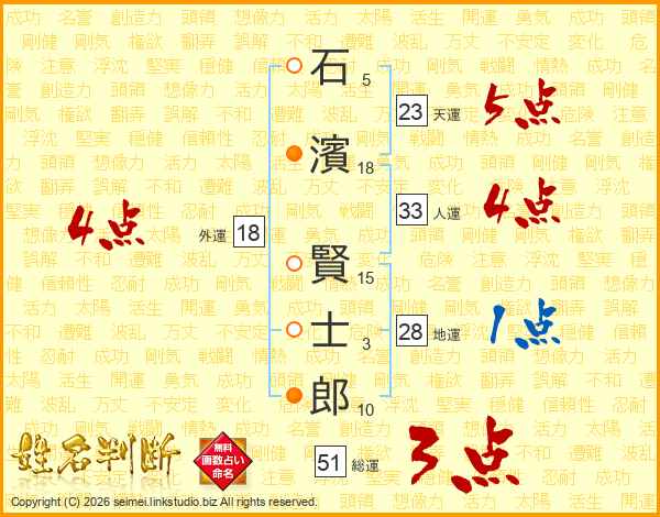 石(5画)濱(18画) 賢(15画)士(3画)郎(10画)