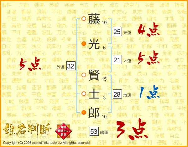 藤(19画)光(6画) 賢(15画)士(3画)郎(10画)