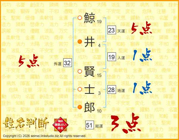 鯨井賢士郎さんの総運は51画の3点!