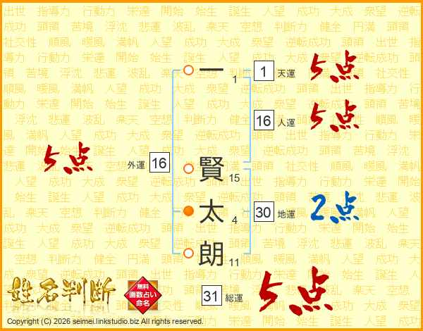 あなたの人生を表す1番重要な運勢です。生涯を通じて影響する総合運となり、主に50歳以降の晩年期に影響を及ぼします。苗字と名前の合計画数。