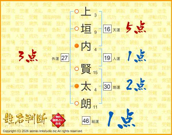 上(3画)垣(9画)内(4画) 賢(15画)太(4画)朗(11画)