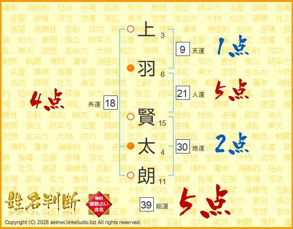 上(3画)羽(6画) 賢(15画)太(4画)朗(11画)