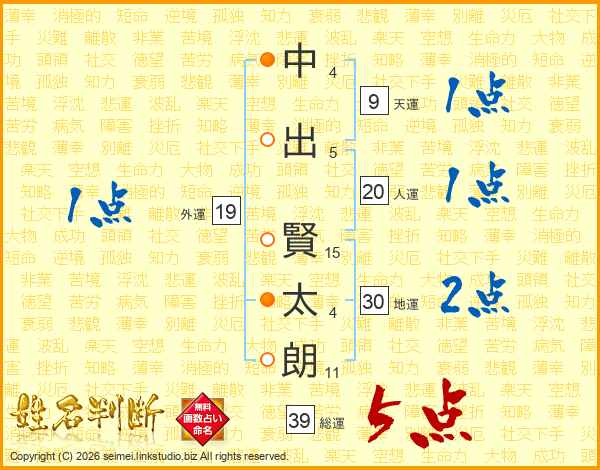 中出賢太朗さんの総運は39画の5点!