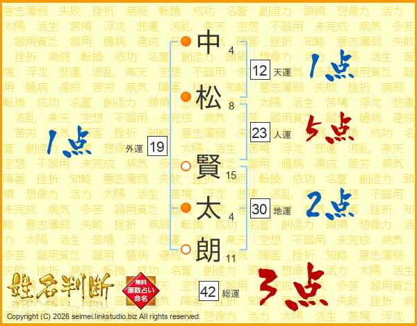 中(4画)松(8画) 賢(15画)太(4画)朗(11画)