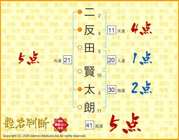 二(2画)反(4画)田(5画) 賢(15画)太(4画)朗(11画)