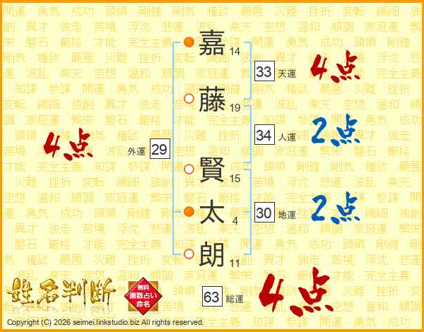 嘉(14画)藤(19画) 賢(15画)太(4画)朗(11画)