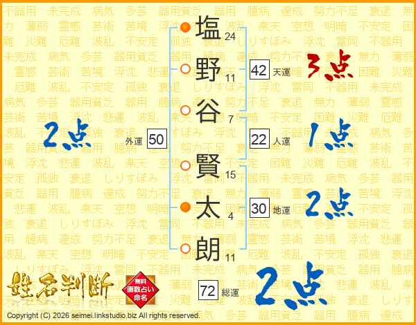 塩(24画)野(11画)谷(7画) 賢(15画)太(4画)朗(11画)