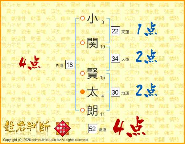 小(3画)関(19画) 賢(15画)太(4画)朗(11画)
