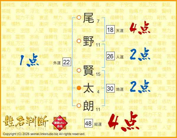 尾(7画)野(11画) 賢(15画)太(4画)朗(11画)