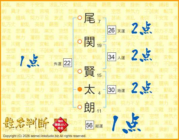 尾(7画)関(19画) 賢(15画)太(4画)朗(11画)
