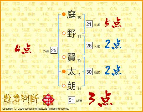 庭(10画)野(11画) 賢(15画)太(4画)朗(11画)
