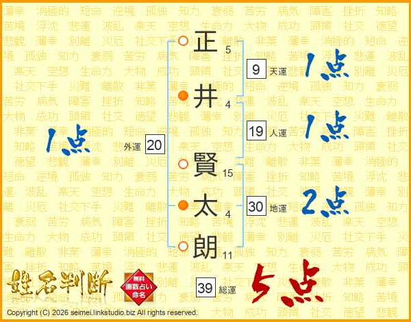 正(5画)井(4画) 賢(15画)太(4画)朗(11画)