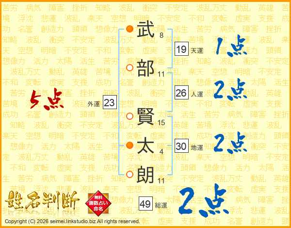 武(8画)部(11画) 賢(15画)太(4画)朗(11画)
