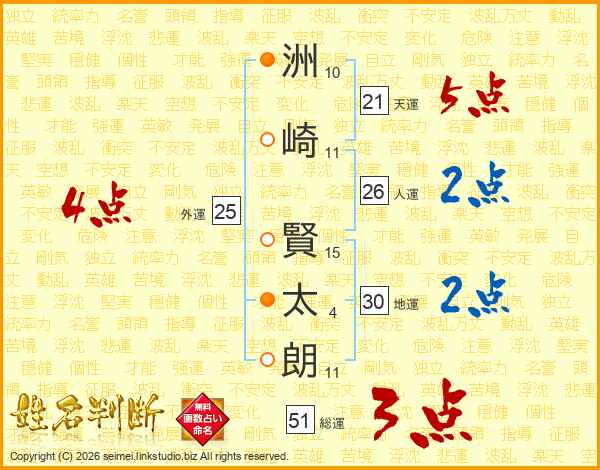 洲(10画)崎(11画) 賢(15画)太(4画)朗(11画)
