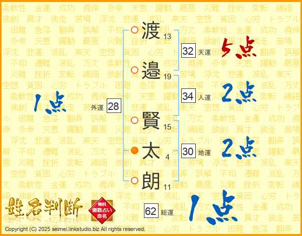 渡(13画)邉(19画) 賢(15画)太(4画)朗(11画)
