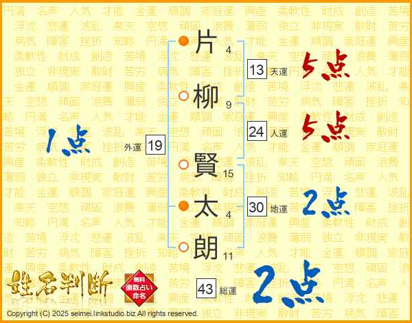 片(4画)柳(9画) 賢(15画)太(4画)朗(11画)