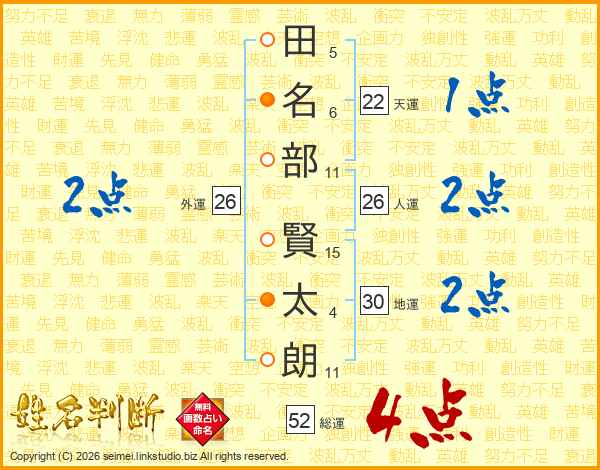 田(5画)名(6画)部(11画) 賢(15画)太(4画)朗(11画)