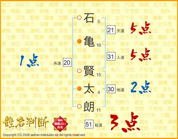石(5画)亀(16画) 賢(15画)太(4画)朗(11画)