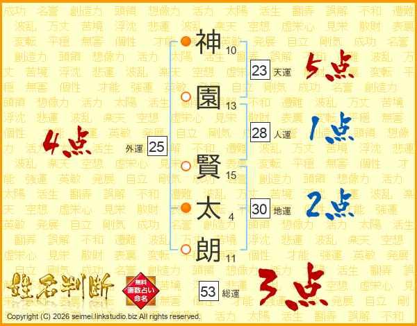 神(10画)園(13画) 賢(15画)太(4画)朗(11画)