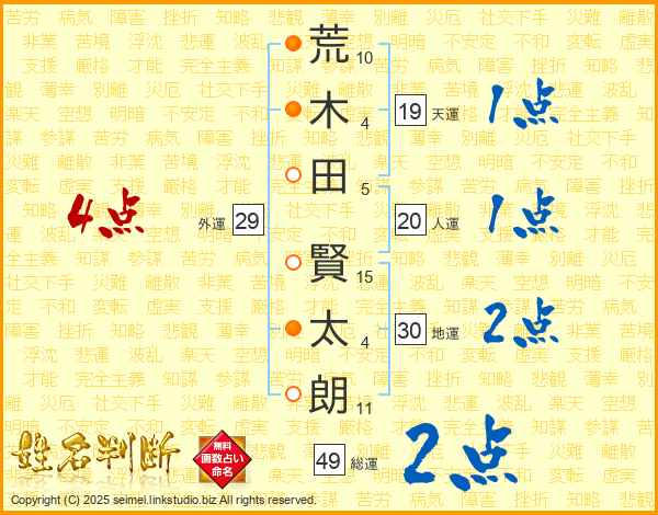 荒(10画)木(4画)田(5画) 賢(15画)太(4画)朗(11画)