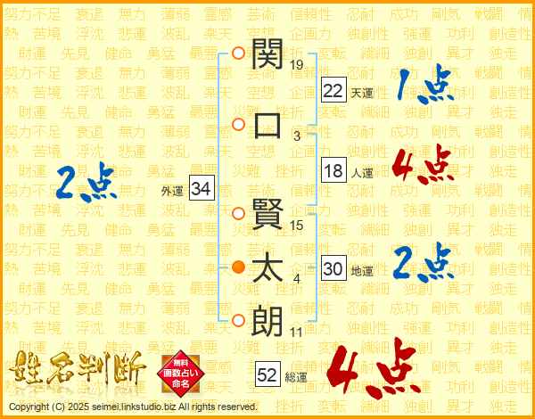 関(19画)口(3画) 賢(15画)太(4画)朗(11画)