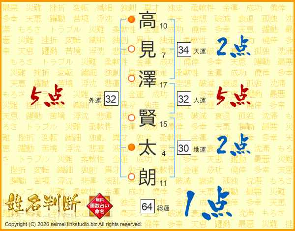 高(10画)見(7画)澤(17画) 賢(15画)太(4画)朗(11画)