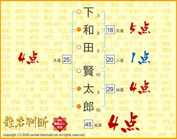 下(3画)和(8画)田(5画) 賢(15画)太(4画)郎(10画)
