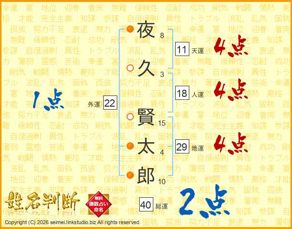 夜(8画)久(3画) 賢(15画)太(4画)郎(10画)