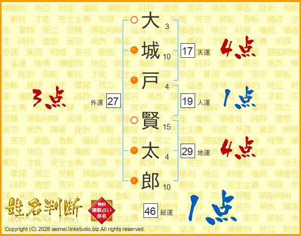 大(3画)城(10画)戸(4画) 賢(15画)太(4画)郎(10画)